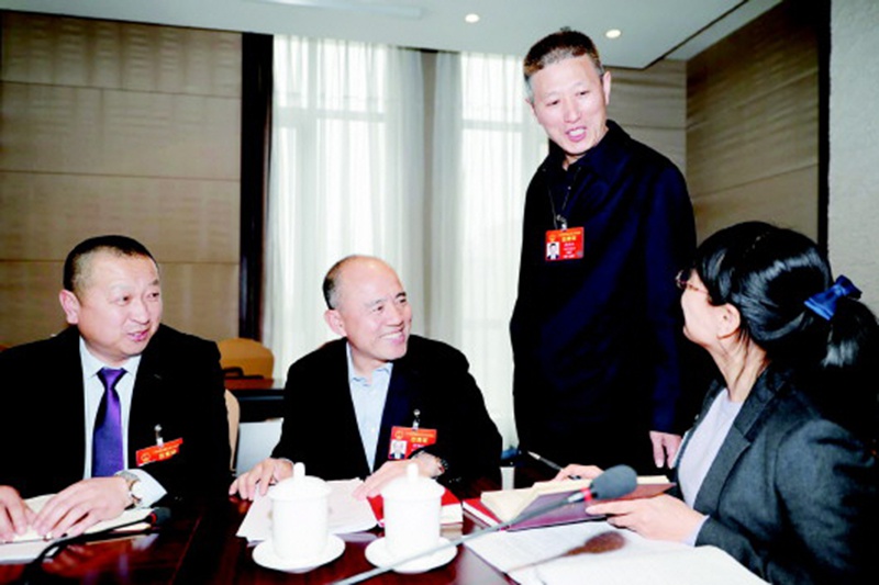 3月9日,山东代表团周建军(左一)、周洪江(右二)等代表讨论宫明杰代表(左二)提出的提高经济作物种植机械化程度的建议。