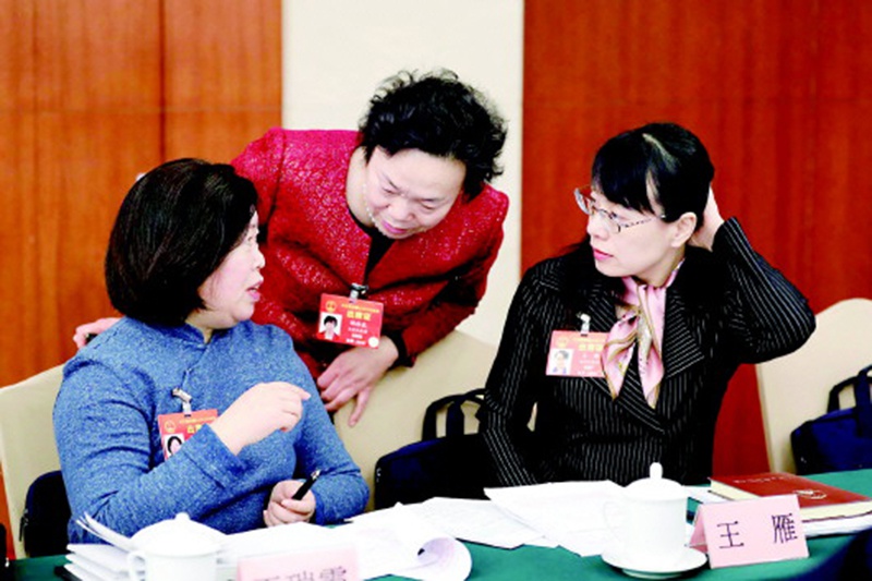 山东代表团代表胡桂花(中)、王瑞霞(左)、王雁,讨论支持民营企业发展的政策举措如何落地落实。(转自《大众日报》手机客户端)